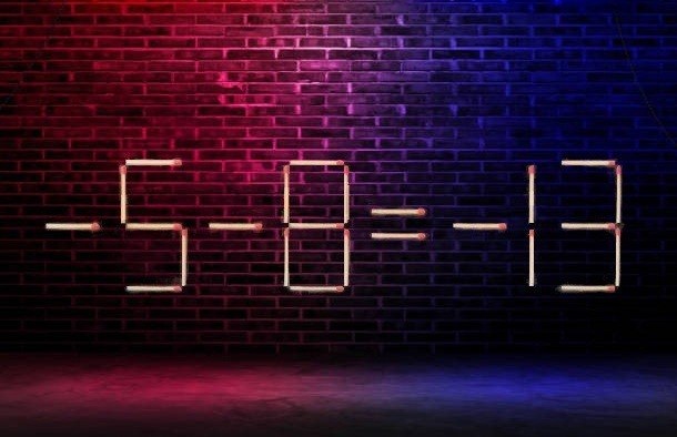 Присмотреться придется к ответу, спичку забираем из цифры «9» и ставим в начало записи. Получилось «-5-8=-13», равенство заиграло новыми красками. Дружите со спичечными головоломками, тренируйте свой интеллект.