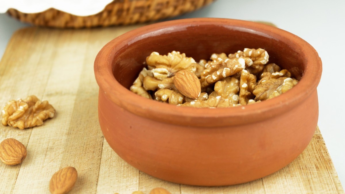 В грецком орехе содержит большое количество омега-3 и богат, витамины A, E, B, C, K, PP. Грецкий орех поддерживает работу мозга, помогает бороться со стрессом, улучшает память и концентрацию, влияет на уровень «хорошего» холестерина.