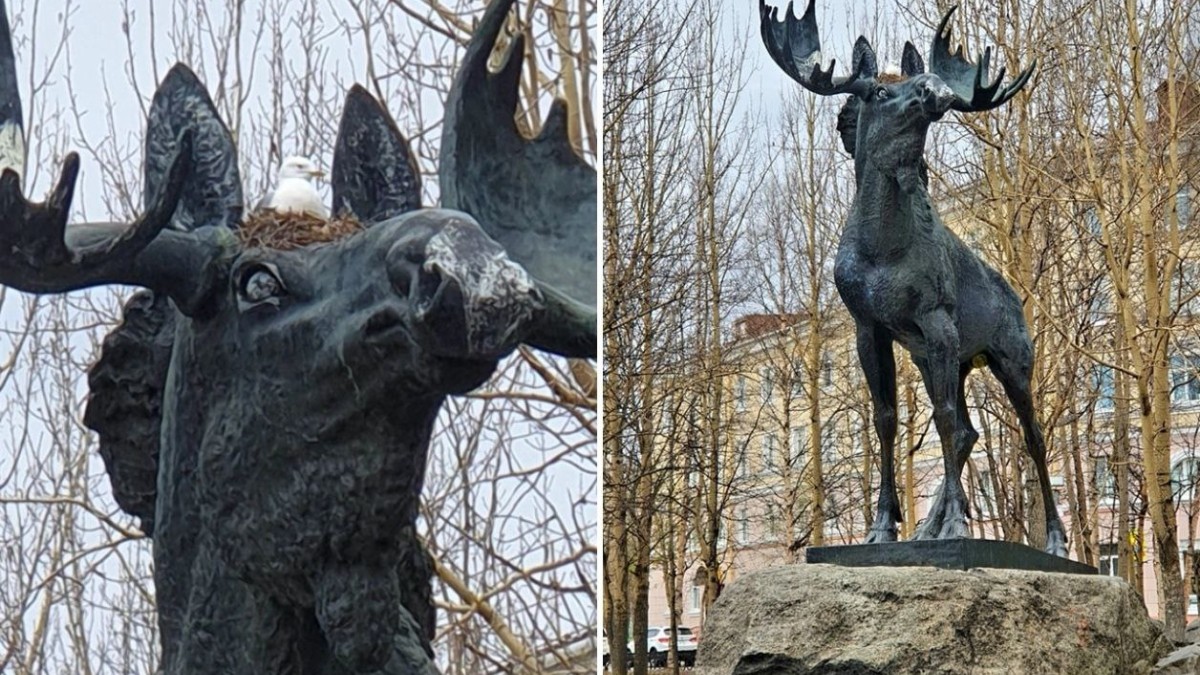 По всей видимости, птицы неслучайно выбрали макушку сохатого для обустройства «домашнего очага» — рога массивной скульптуры с обеих стороны закрывают птенцов от ветра и непрошенных гостей.