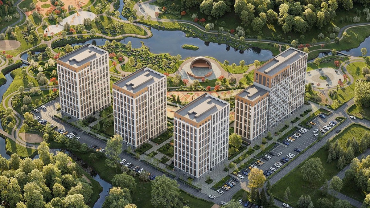 На фото можно увидеть план будущих 4-5 жилых домов, они станут первым этапом застройки. У жилого комплекса немалое количество водоемов «под боком»: ручей, озеро и болото в низине.