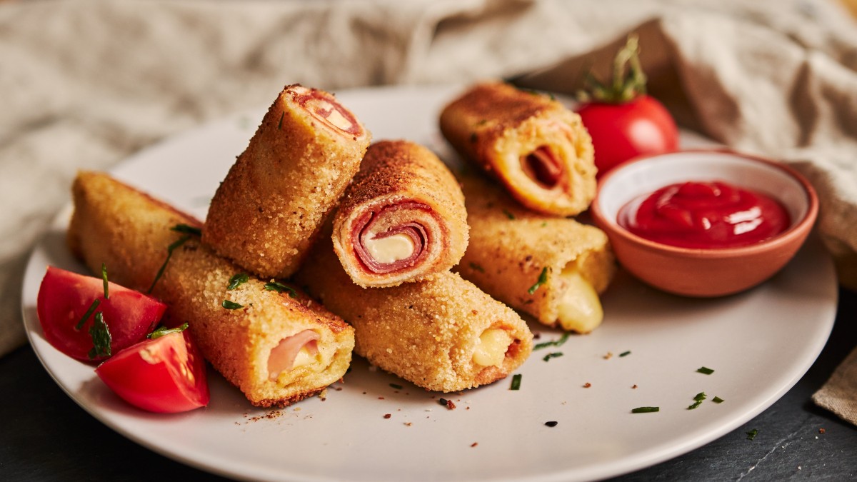 Перед выпечкой надо всё смазать яйцом. Наши рулетики отправляют в духовку минут на 20 при 180 градусах. И вкусно, и хрустяще получается.