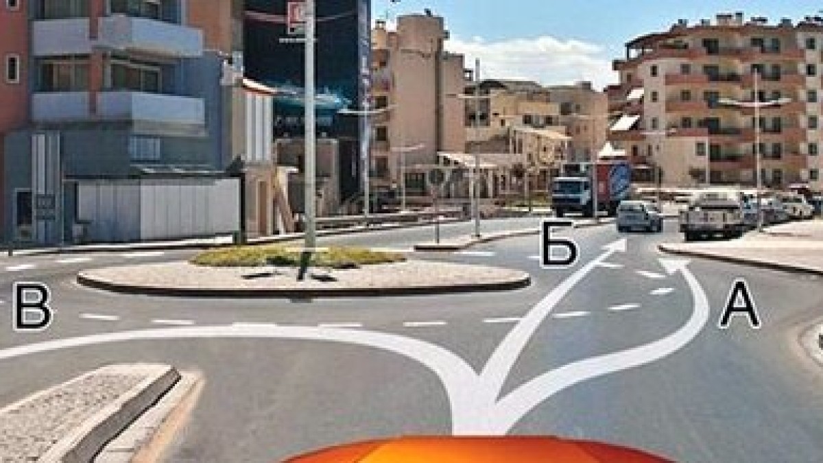 На рисунке вы видите знак «Круговое движение» и 3 направления. Траектория В — это явное нарушение, так как означает выезд на встречную полосу. По траектории Б машина также может столкнуться с автомобилем, движущимся по кругу.