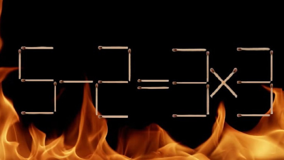 Взгляните на иллюстрацию, вот головоломка на проверку вашей сообразительности. В примере «5-2=3×3» спряталась ошибка, исправить которую поможет перестановка всего одной спички. Найдите нужный элемент и подкорректируйте равенство.