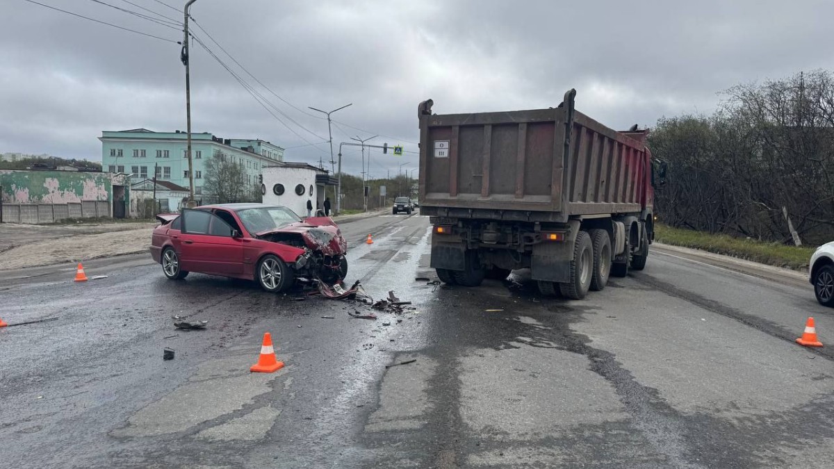 Грузовой автомобиль «Вольво» и легковой «БМВ» столкнулись в районе дома № 5 по улице Мурманское шоссе в Североморске. Установлено, что грузовик при выезде с прилегающей территории (со стороны Флотских Строителей, 9), не предоставил преимущество движению легковому автомобилю. Произошло страшное столкновение.