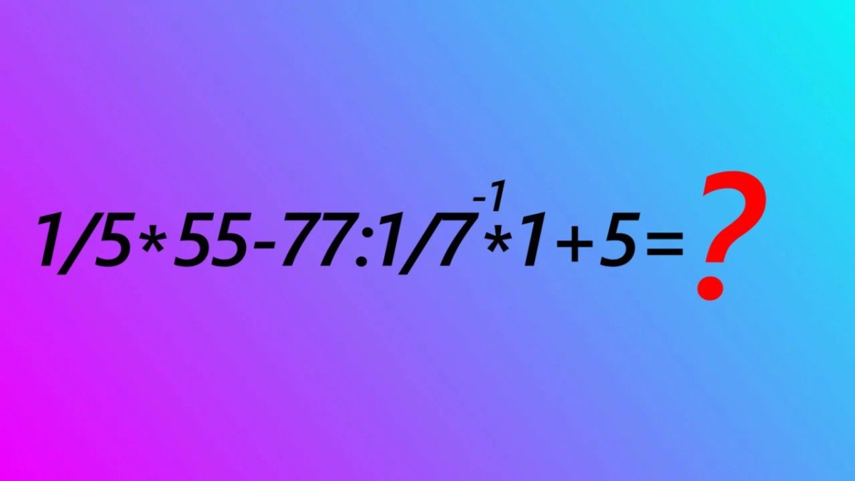 Представляем вашему вниманию арифметический пример с подвохом. Вас ждут вычисления ⅕ х 55-77:(1/7)-1×1+5, непростая запись для устного счета. Возведение в отрицательную степень сразу обращает на себя внимание, что будете делать?