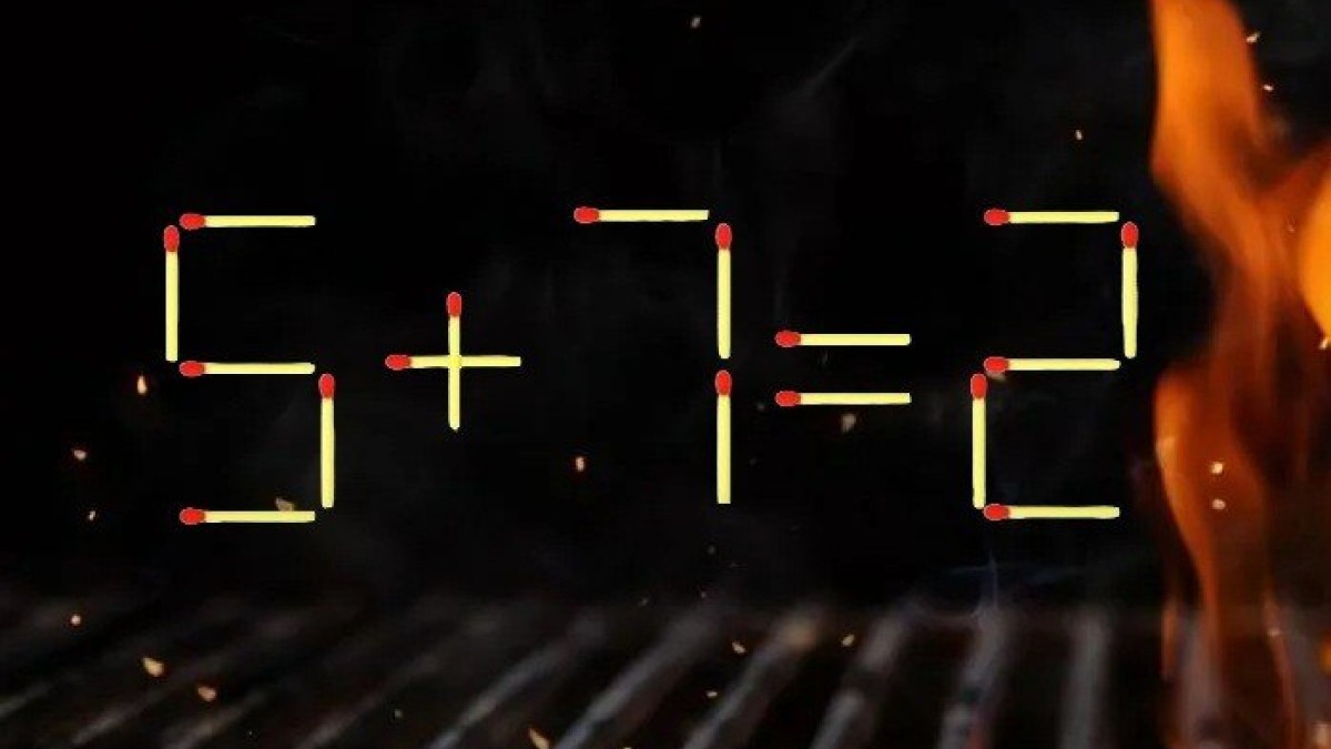Внимание на иллюстрацию, перед вами спичечное равенство «5+7=2». Запись явно составлена неверно, но перестановка всего одной детали вернет арифметическую справедливость.