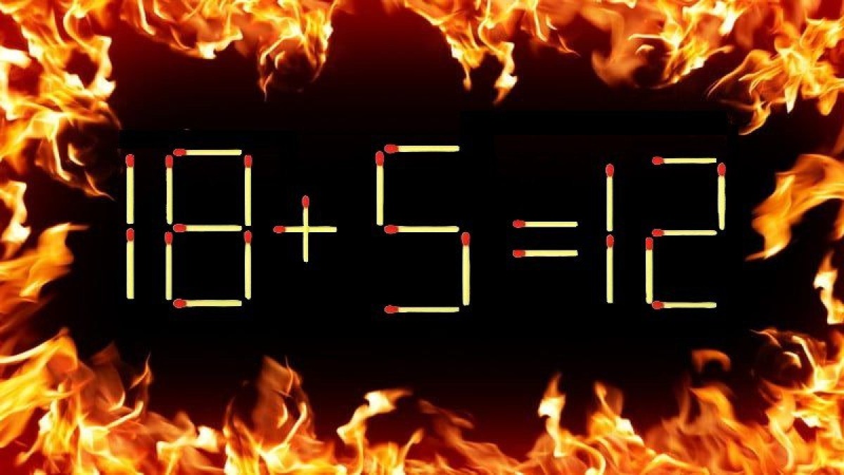 На иллюстрации показана запись «18+5=12». В равенстве допущена ошибка, исправить которую поможет перестановка всего одной спички.