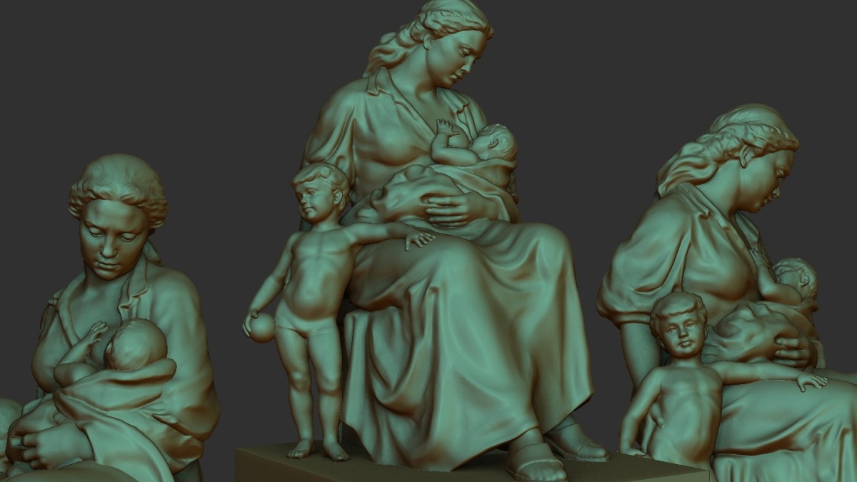«Первые созданные при помощи 3Д-технологий скульптуры уже прошли процедуру согласования с командой и руководителем проекта. Демонстрируем результат. Перед вами фото в нескольких проекциях и видео — рендер скульптуры „Материнство“», — сообщили скульпторы.