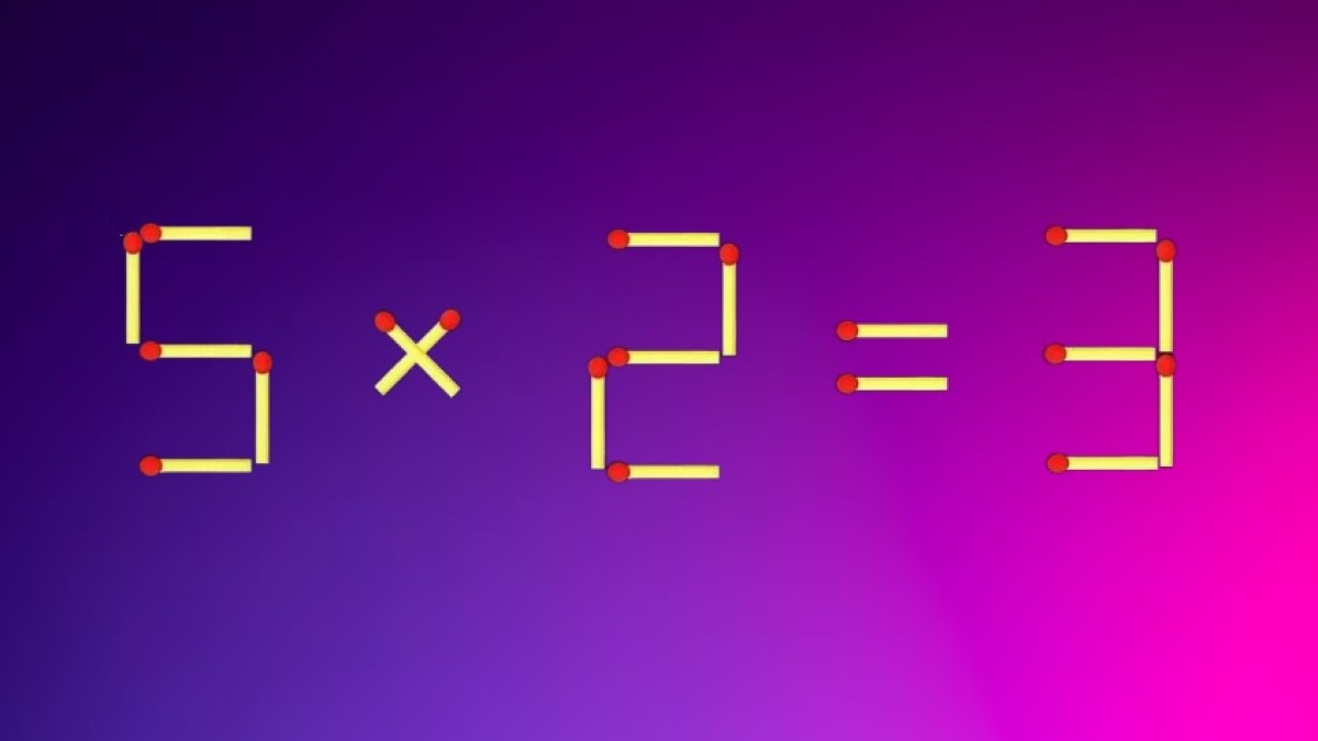 На иллюстрации показано равенство «5×2=3». Пример намеренно составлен с ошибкой, вам необходимо ее исправить, переместив всего одну спичку.