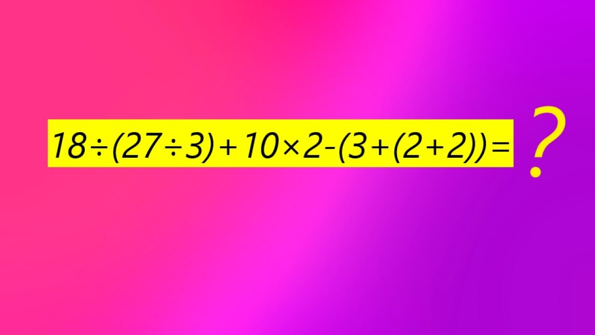 Давайте посмотрим на иллюстрацию, прямо сейчас нас ждет пример 18÷(27÷3)+10×2-(3+(2+2)). Непростое задание на внимательность, ведь сами вычисления ограничиваются таблицей умножения.