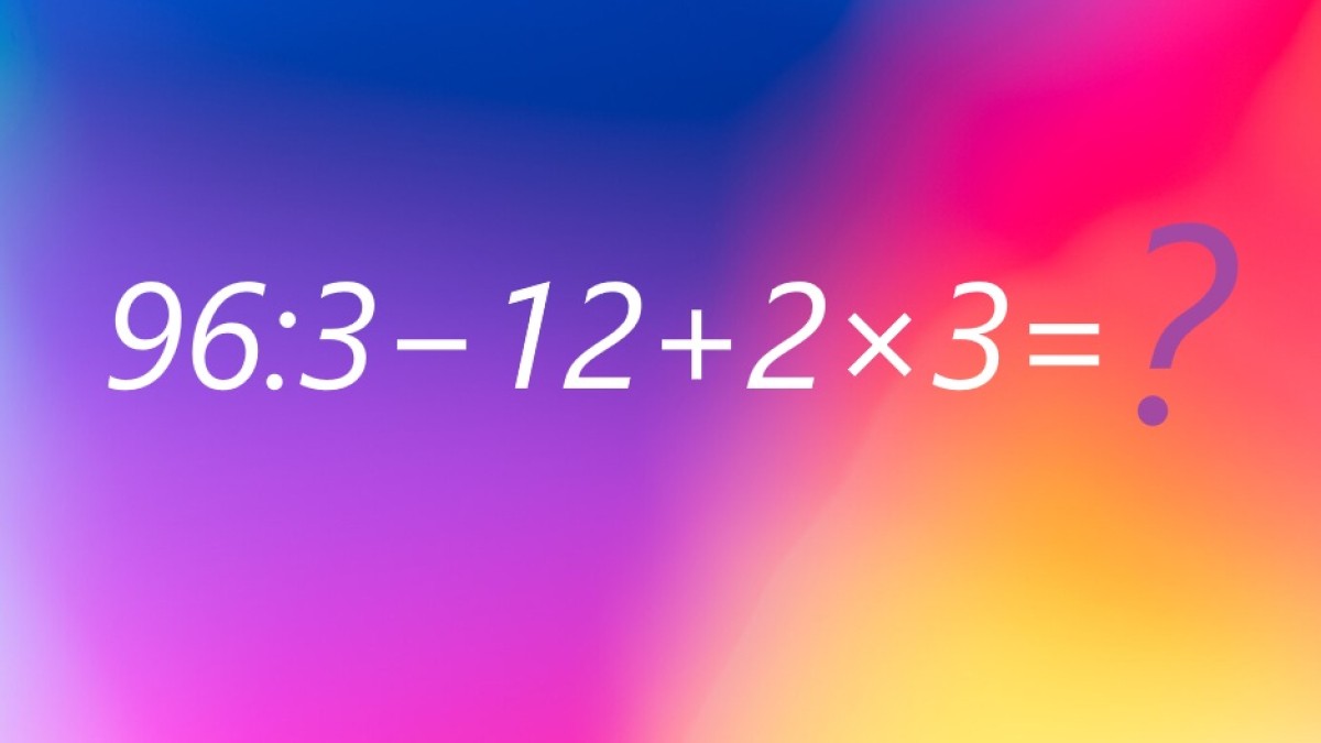Представляем вашему вниманию задание на иллюстрации. Дан пример для устного счета 96:3−12+2×3, с которым могут справиться школьники. Проверим ваше внимание и память.
