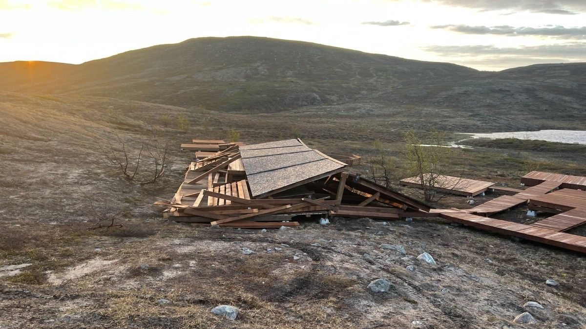 На финишной точке экологического маршрута «555» в Мурманской области туристам больше негде передохнуть – домик рухнул, его больше нет. Об этом сообщили в группе «Никель [NI]».