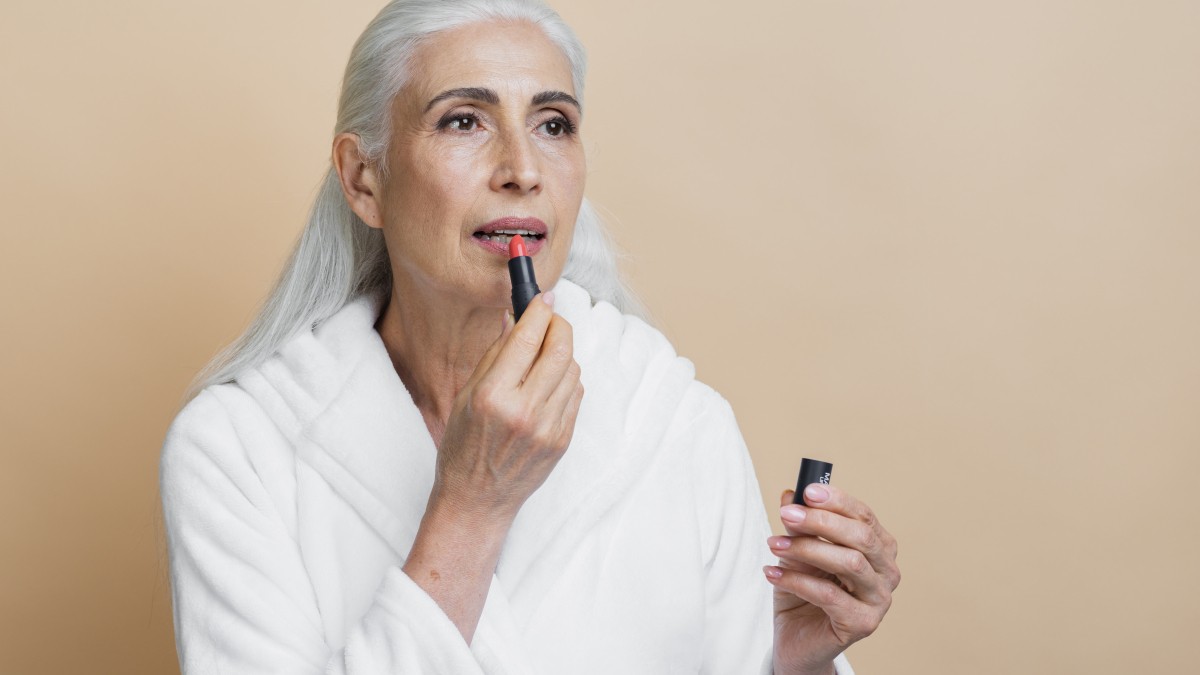 Яркую помаду наносите кисточкой. Так получится аккуратнее, и цвет будет ровнее. Начинайте с центра губ к краям. Матовые текстуры держатся лучше и меньше подчеркивают морщинки.
