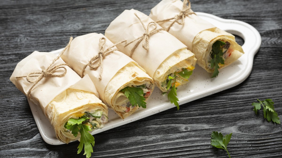 Начинку равномерно распределите по лавашу и сверните рулетиком. Шов нужно хорошенько закрыть, чтобы ничего не вытекало.