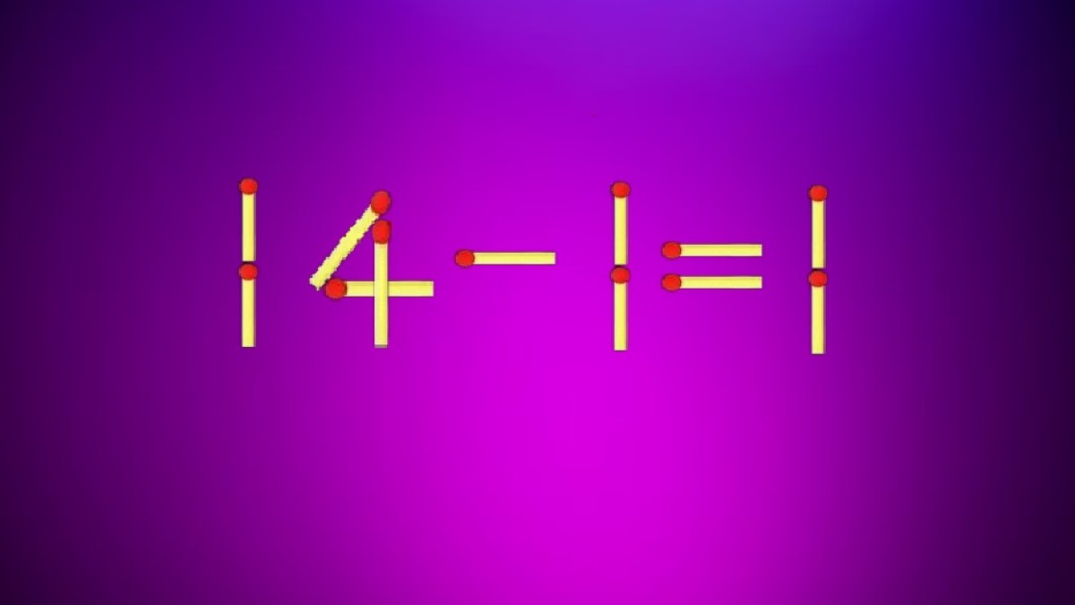 Посмотрите на иллюстрацию, в примере «14-1=1» намеренно допущена ошибка. Подберите верный способ решения, который можно составить при помощи перемещения только одной спички в этой записи.