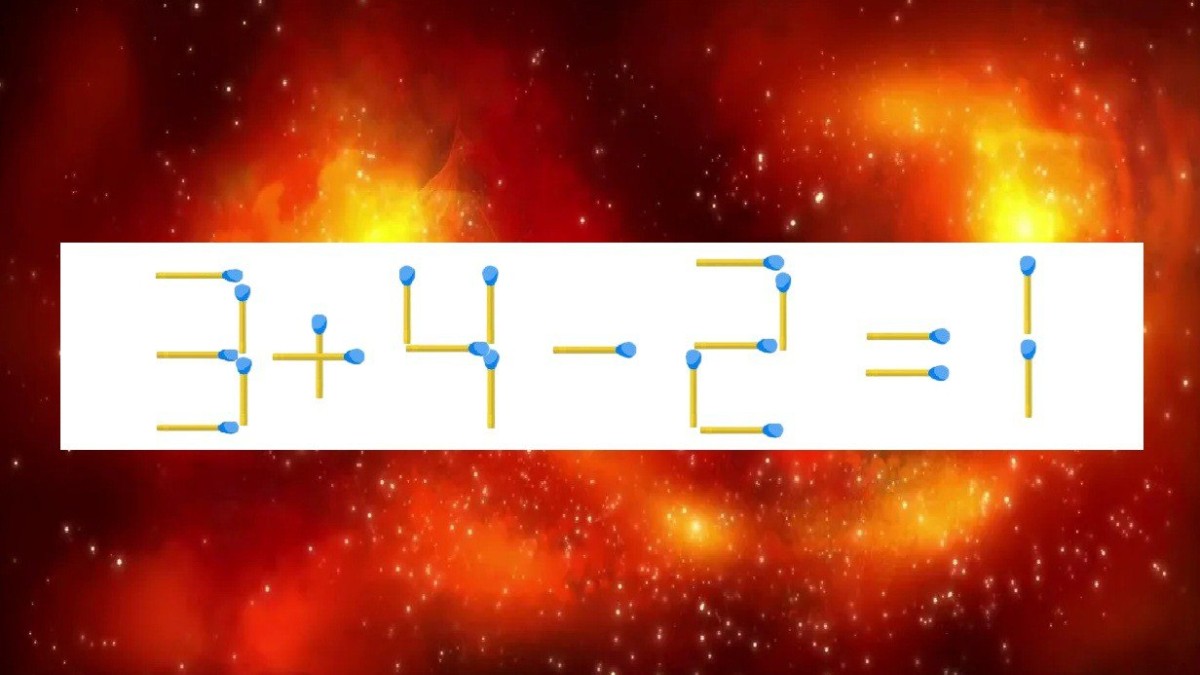 Прямо сейчас у вас есть возможность испытать себя такой головоломкой, внимание на изображение. В равенстве «3+4-2=1» намеренно допущена ошибка. Вам предстоит перемести одну спичку в записи, чтобы исправить ситуацию.