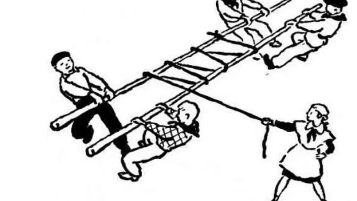 На рисунке изображены 4 мальчика и 1 девочка. Мальчики тянут на себя палки, связанные веревкой. Девочка тоже в деле.