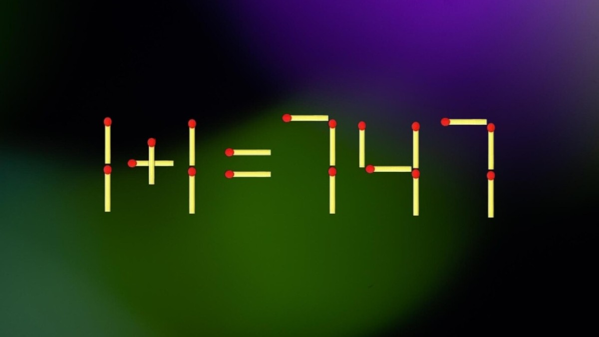 В нашем распоряжении оказалась одна из таких головоломок, внимательно посмотрите на иллюстрацию. Равенство «1+1=747» составлено с ошибкой, найдите возможность исправить запись при помощи перестановки одной спички.