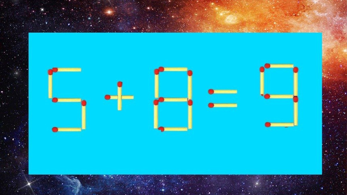 Давайте устроим проверку вашему интеллекту прямо сейчас. На рисунке вас ждет хитрое задание. Из спичек составлен пример «5+8=9», как видите, в решении есть ошибка. Необходимо исправить запись, переместив только один элемент в нем.