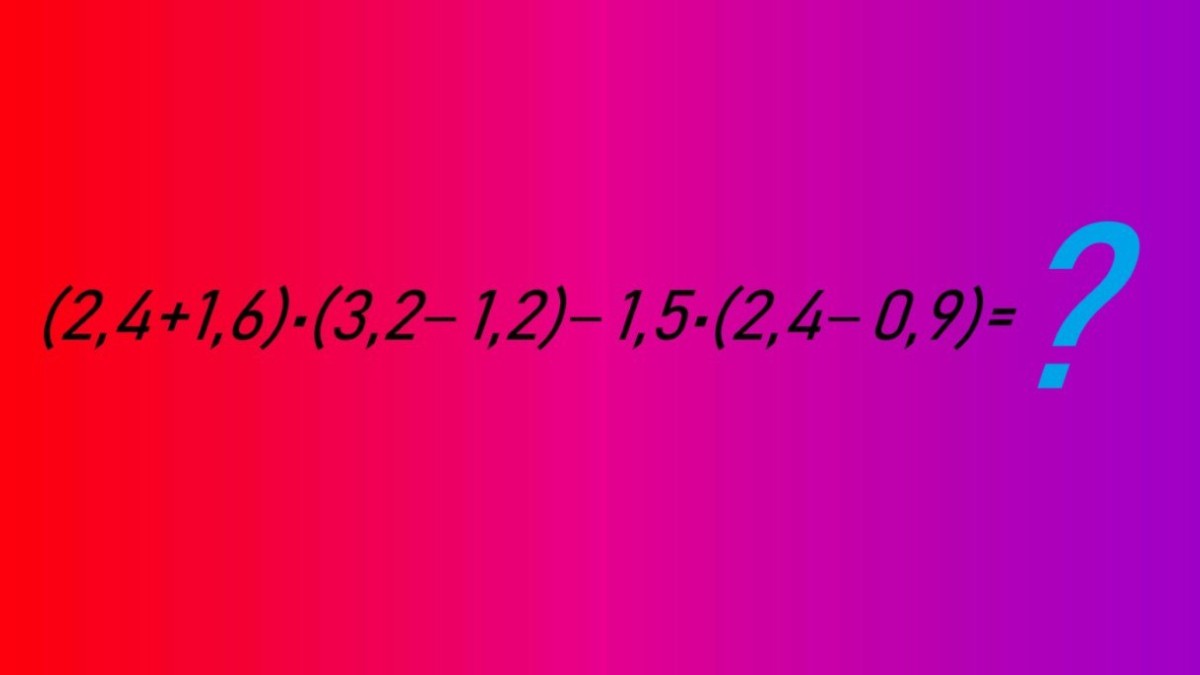 Взгляните на иллюстрацию, вас ждет объемное задание (2,4+1,6)•(3,2−1,2)−1,5•(2,4−0,9). Необходимо выполнить все вычисления устно, чтобы проверить свою память в деле.