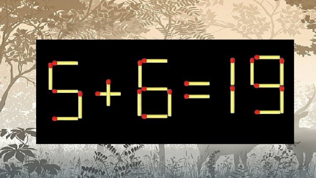 Взгляните на иллюстрацию, перед вами равенство «5+6=19». В примере намеренно допущена ошибка, исправить ее поможет перемещение всего одной спички. Принимайтесь скорее за дело.