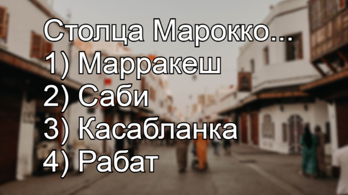 Марокко — страна, где встречаются Атлантика и Средиземное море, пустыня Сахара и вершины Атласа. Здесь можно пройтись по базарам с ароматами специй, полюбоваться мечетями, дворцами и садами, а также окунуться в атмосферу сказок «Тысячи и одной ночи». Однако не все сразу могут назвать столицу этого яркого королевства. Попробуйте себя!