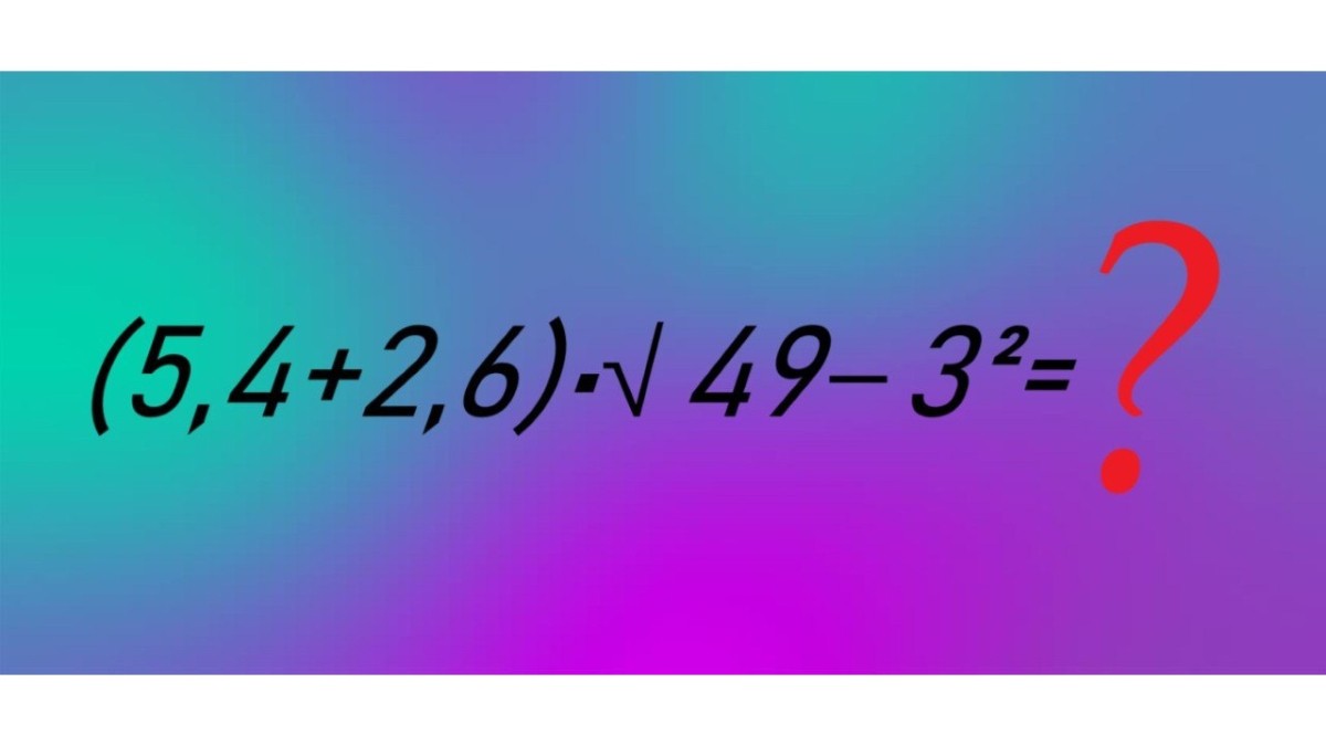 В вашем распоряжении каверзное задание. На рисунке представлен пример (5,4+2,6)•√49−3², а школьная практика осталась далеко в прошлом. Вычислить необходимо устно, промежуточные действия держим в уме, калькулятором не пользуемся.