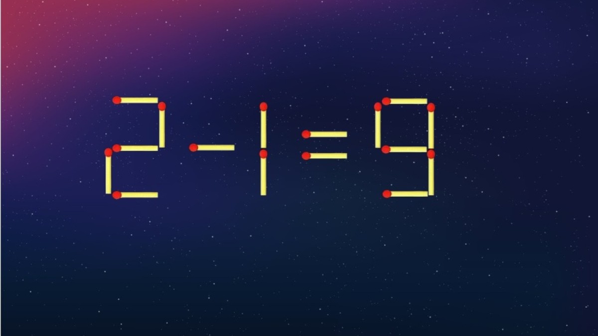 На иллюстрации вас ждет хитрая загадка. Из спичек составлено равенство «2-1=9», но в запись закралась ошибка. Давайте переместим один элемент так, чтобы пример стал верным. Остальные спички нельзя убирать или ломать.