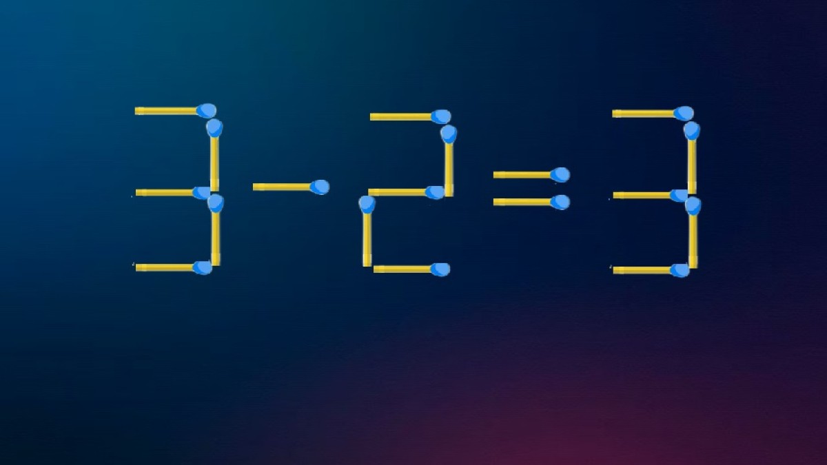 Представляем вашему вниманию запись «3-2=3», показанную на иллюстрации. В пример закралась ошибка, давайте переместим одну спичку, чтобы сделать равенство снова верным. Пространственное воображение поможет вам взглянуть на ситуацию под нужным углом.