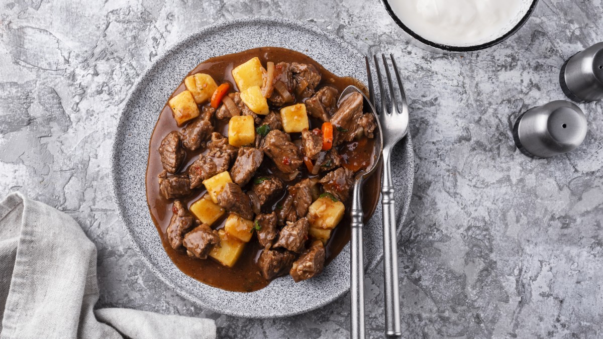 Сначала мясо надо порезать кубиком и пожарить на сильном огне до корочки. Лук пассеруется отдельно, его надо немного посыпать сахаром для карамелизации. Потом мясо и лук тушат в воде минут 40.