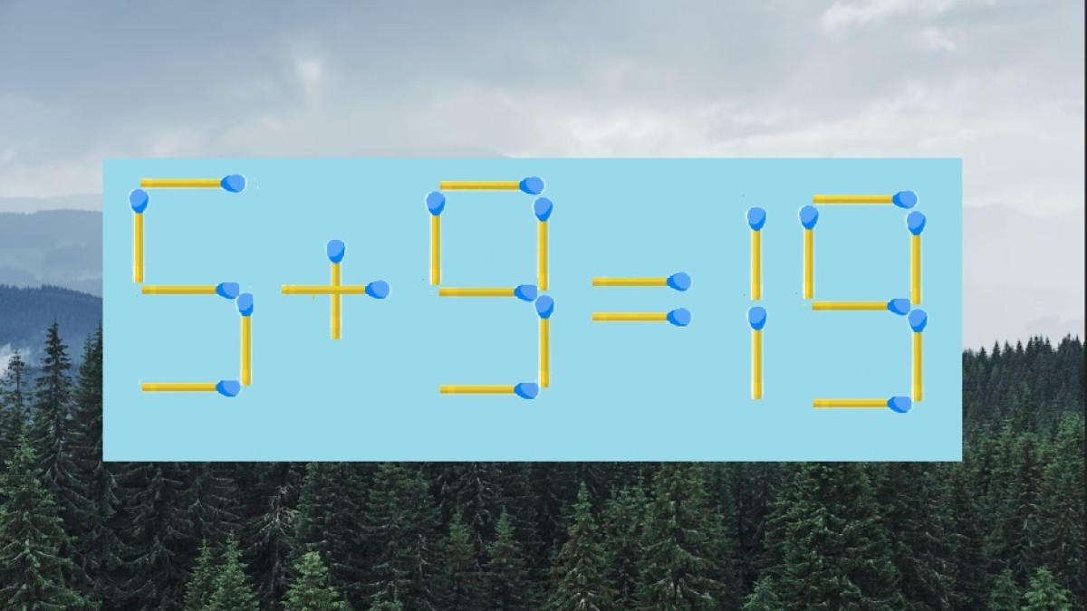 Взгляните на рисунок с головоломкой, вас ждет перестановка спичек. Равенство «5+9=19» явно составлено с ошибкой, найдите способ исправить запись. Переместить разрешается всего одну спичку, без смекалки будет не справиться.