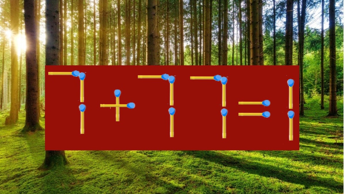 Посмотрите на иллюстрацию, перед вами спичечная головоломка на перестановку. В примере «7+77=1» намеренно допущена ошибка, вам предстоит ее исправить. Подключите логическое мышление и переместите одну спичку так, чтобы правила арифметики не страдали.