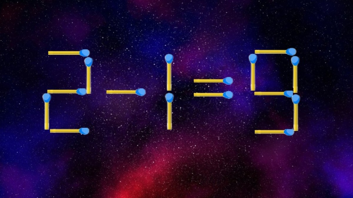 Взгляните на иллюстрацию, перед вами визуальная головоломка. Из спичек составлен пример «2-1=9», но в решение явно закралась ошибка. Необходимо передвинуть всего одну спичку, чтобы исправить равенство. Готовы испытать свои способности?