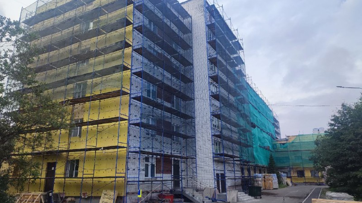 Благодаря федеральным и региональным проектам развития в Мурманске капитально отремонтируют Дом-интернат для престарелых и инвалидов на улице Старостина. Сейчас строители утепляют наружные стены, монтируют фасад. Внутри здания предстоит заменить напольные покрытия, заменить балконные ограждения и подготовиться к монтажу архитектурно-художественной подсветки.