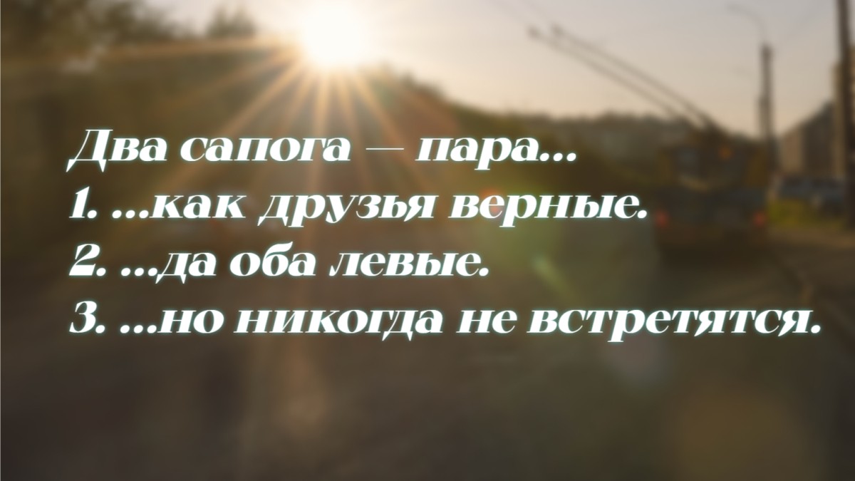Как часто про милующихся влюбленных говорят: «Два сапога — пара». Конечно, тот, кто припечатывает их этой поговоркой, не знает её продолжения.
