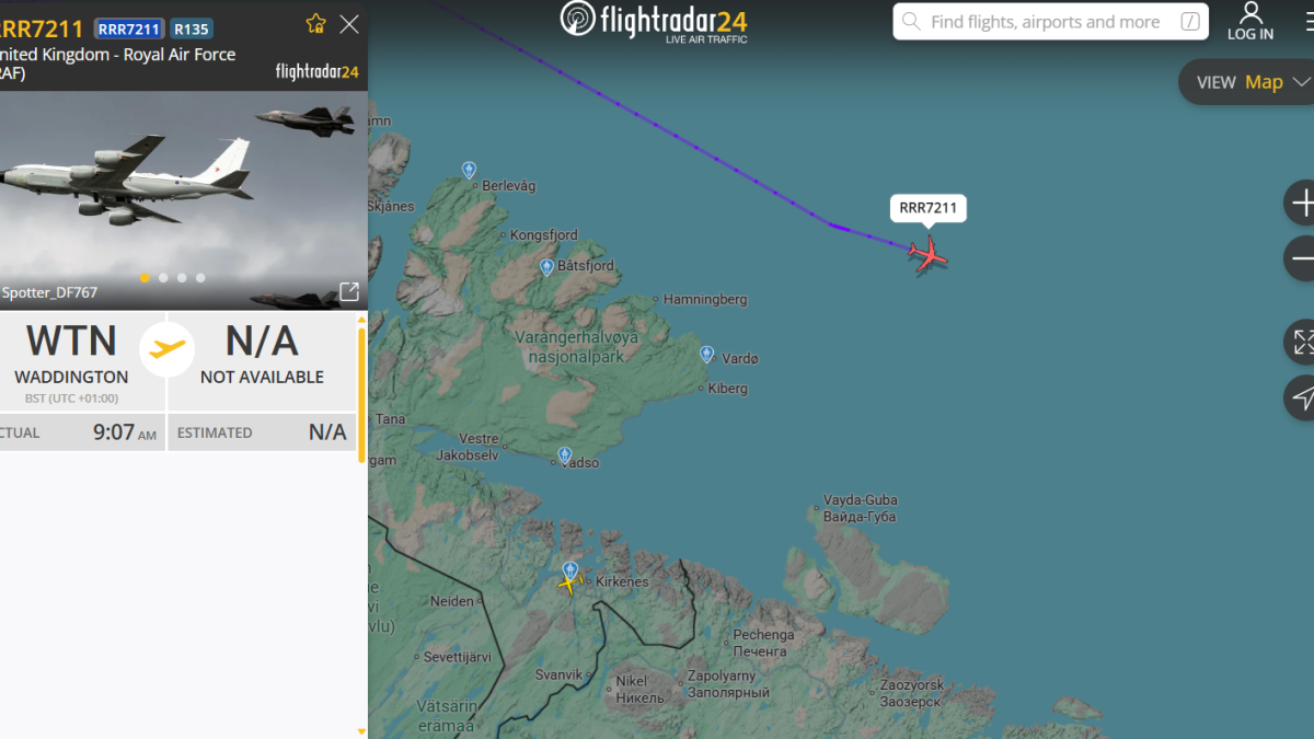 Со стороны Баренцева моря вдоль границ Мурманской области пролетает самолёт Boeing RC-135V Rivet Joint Королевских военно-воздушных сил Великобритании с позывным RRR7211, следует из данных системы Flightradar24.