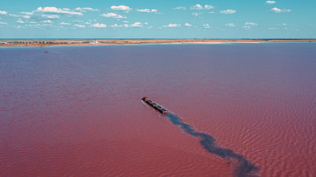 Озеро имеет розовый цвет. Но оно уникально не только по этой причине. По его дну проложена железная дорога.