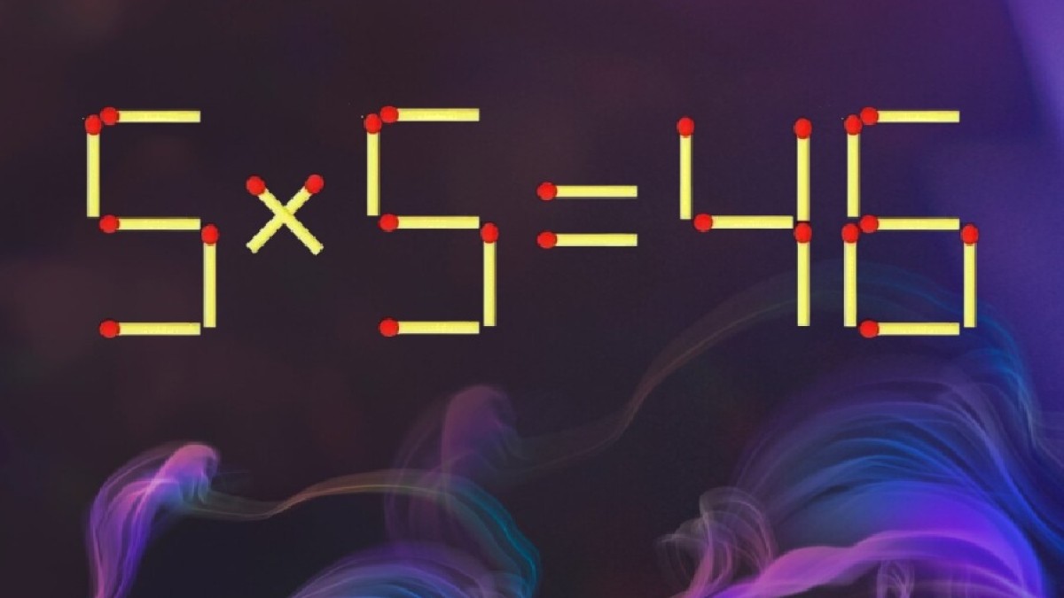 Представляем вашему вниманию равенство «5×5=46», взгляните на рисунок. В пример закралась ошибка, но исправить ситуацию поможет смекалка. Передвиньте одну спичку в записи так, чтобы равенство стало верным.