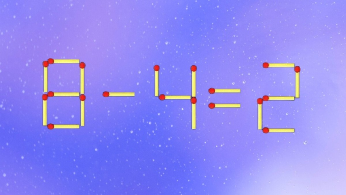 На иллюстрации показано равенство «8-4=2», как видите, в примере содержится ошибка. Вам предстоит передвинуть одну спичку в этой записи таким образом, чтобы решение стало верно.