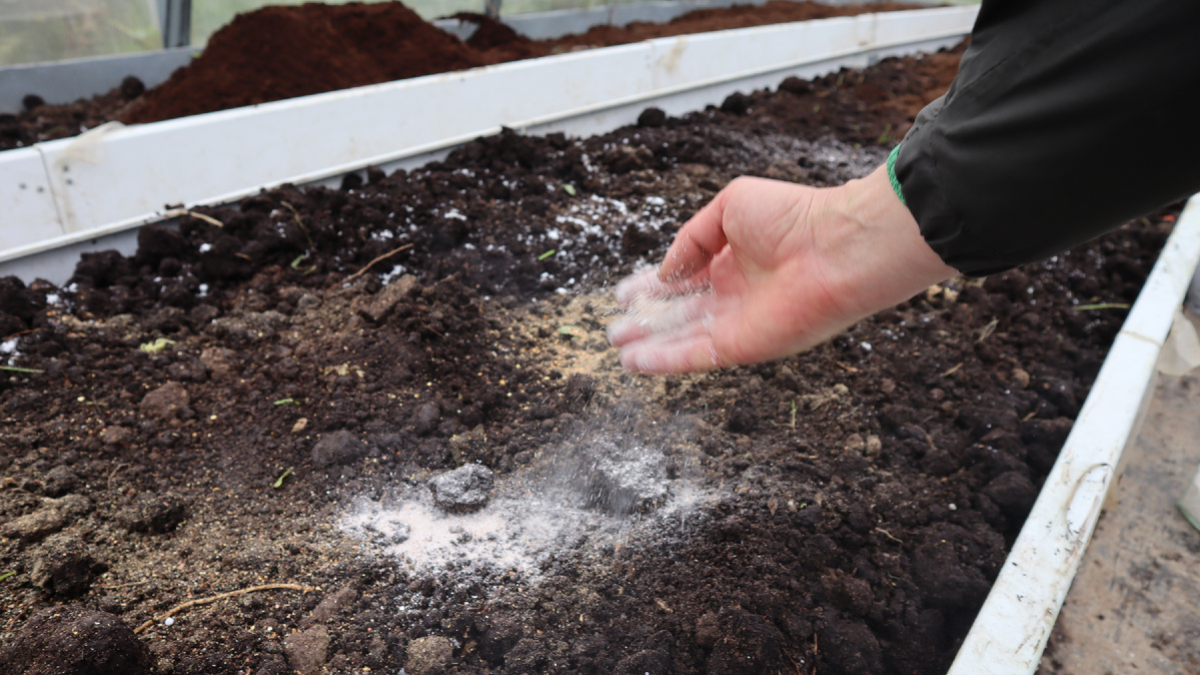 К нему добавляю доломитовую муку, которая убирает лишнюю кислоту. Затем обычную золу — она добавляет калия.