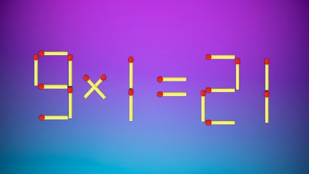 Внимание на иллюстрацию, в равенство «9×1=21» закралась ошибка. Давайте переместим одну спичку так, чтобы пример стал верным. Придется подключить смекалку.