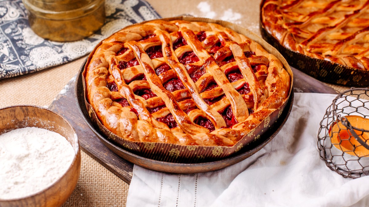 Поделите тесто на две части. Одну раскатайте и положите в форму, а сверху выложите нарезанные фрукты — яблоки, груши, ягоды, что есть дома. Фрукты можно посыпать корицей. Затем накройте второй частью теста или сделайте решетку.