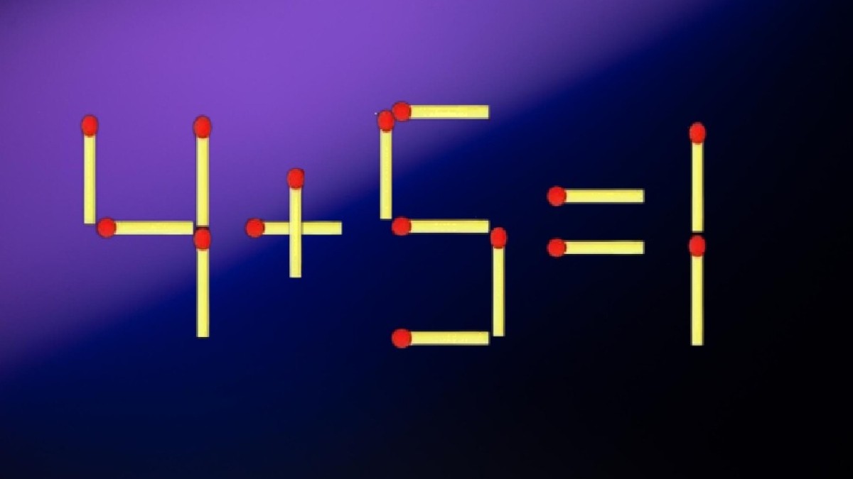 На иллюстрации вы видите равенство «4+5=1», в котором намеренно допущена ошибка. Достаточно переместить всего одну спичку в записи, чтобы решение стало верным. Отыщите эту возможность.