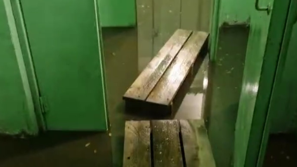 Судя по всему, УК попыталась спасти ситуацию. На кадрах видны брошенные в подъезде деревянные паллеты. Однако этого оказалось недостаточно, ведь пройти к лифту или лестнице, не замочив ноги, невозможно.