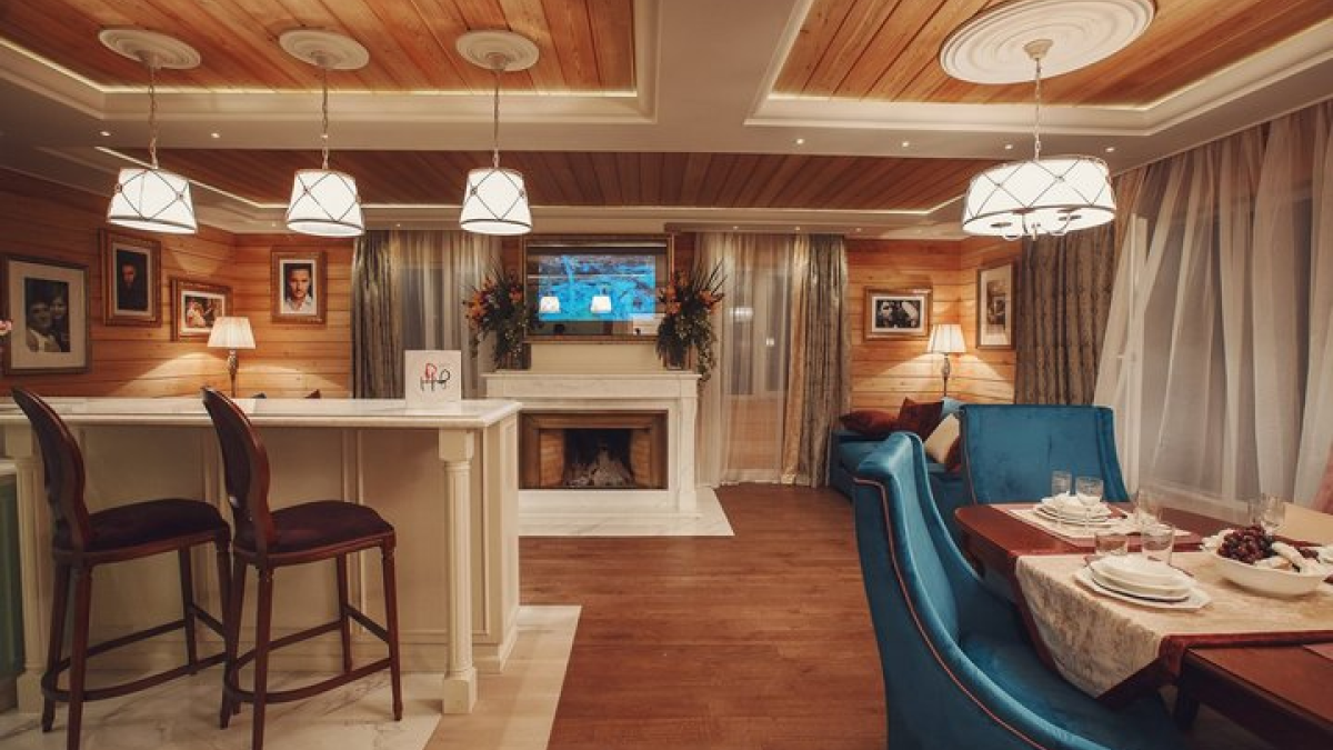 Снаружи дом выглядит просто и современно, с коричневой черепичной крышей. Внутри тоже нет никакой вычурной роскоши. Вместо золота и мрамора — дерево и спокойные цвета. Самое яркое место — кухня с фасадами мятного цвета. В гостиной стоит простенький диван и камин, что вместе создает уютную атмосферу. В гостиной стоит простой диван и камин. Весь дом продуман для жизни, а не для показухи. Это место, где Лазарев по-настоящему отдыхает с семьей.
