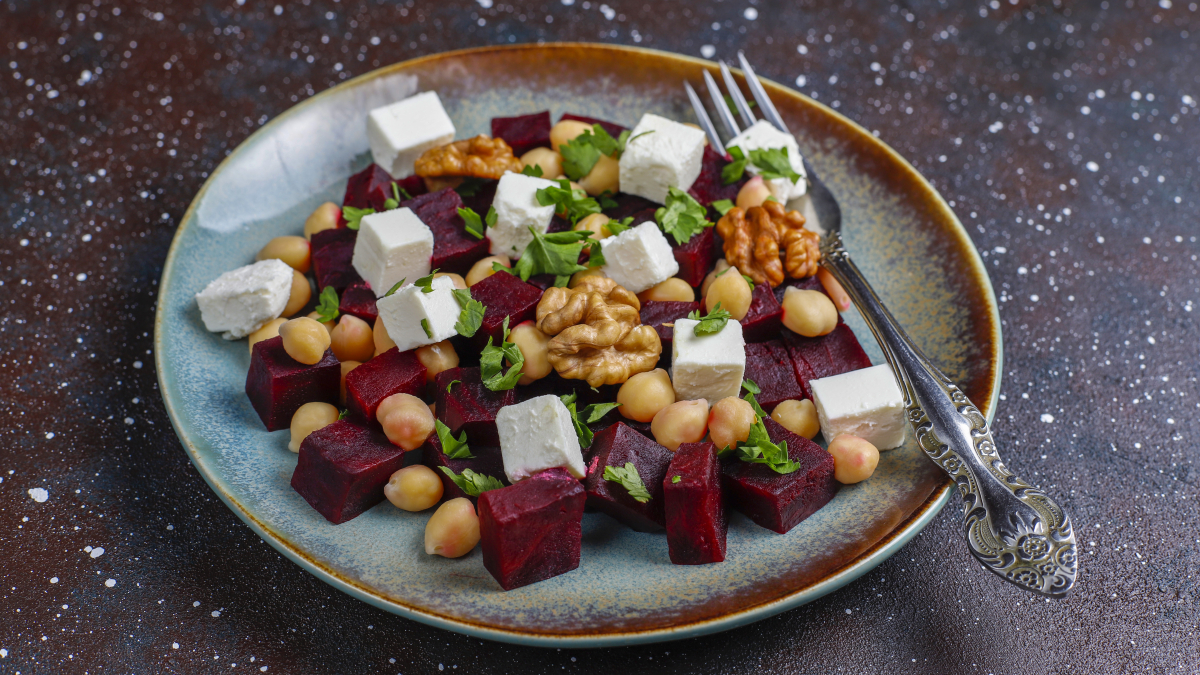 Свеклу аккуратно выложите на блюдо, сверху добавьте кусочки сыра, полейте приготовленной заправкой. Соль и молотый перец добавьте по вкусу. И последний штрих — украсьте салат хрустящими орешками.