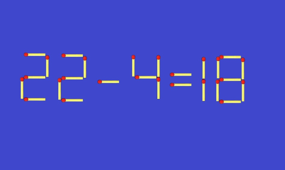 Подсказываем, вам придется изменить действие на вычитание, а свободную спичку смело отправляем в ответ. Посмотрите на результата, у вас должно получиться равенство «22-4=18». Справились прекрасно!