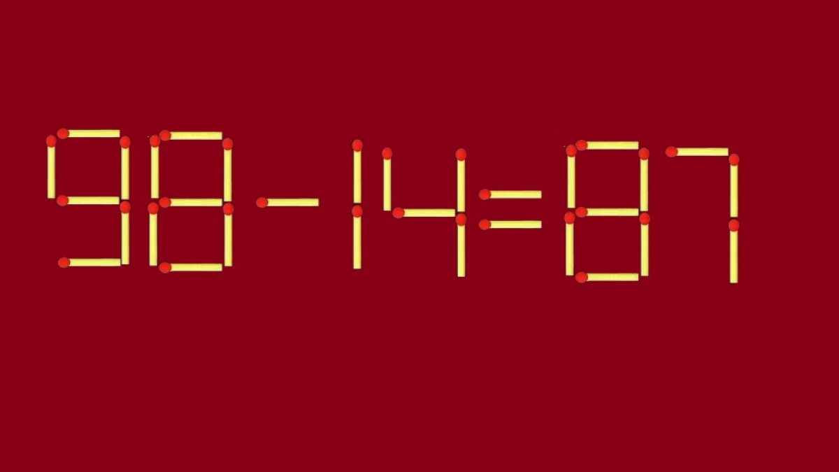 Представляем вашему вниманию равенство на иллюстрации. Пример «98-14=87» явно составлен неверно, вам под силу исправить это положение, передвинув только одну спичку. Примените свои таланты, и получится корректная запись.