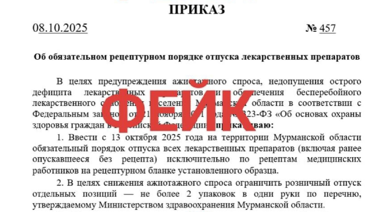 В мессенджерах и социальных сетях распространяется документ, согласно которому в Мурманской области планируется ввести отпуск всех лекарственных препаратов только по рецепту. Этот приказ — фейк.