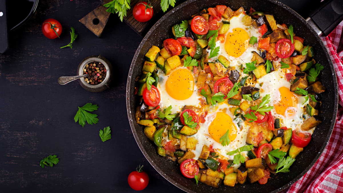 Яйца прекрасно сочетаются с овощами — попробуйте продумать свой завтрак так, чтобы в нем оказались и яйца как источник белка, так и овощи — источник клетчатки.